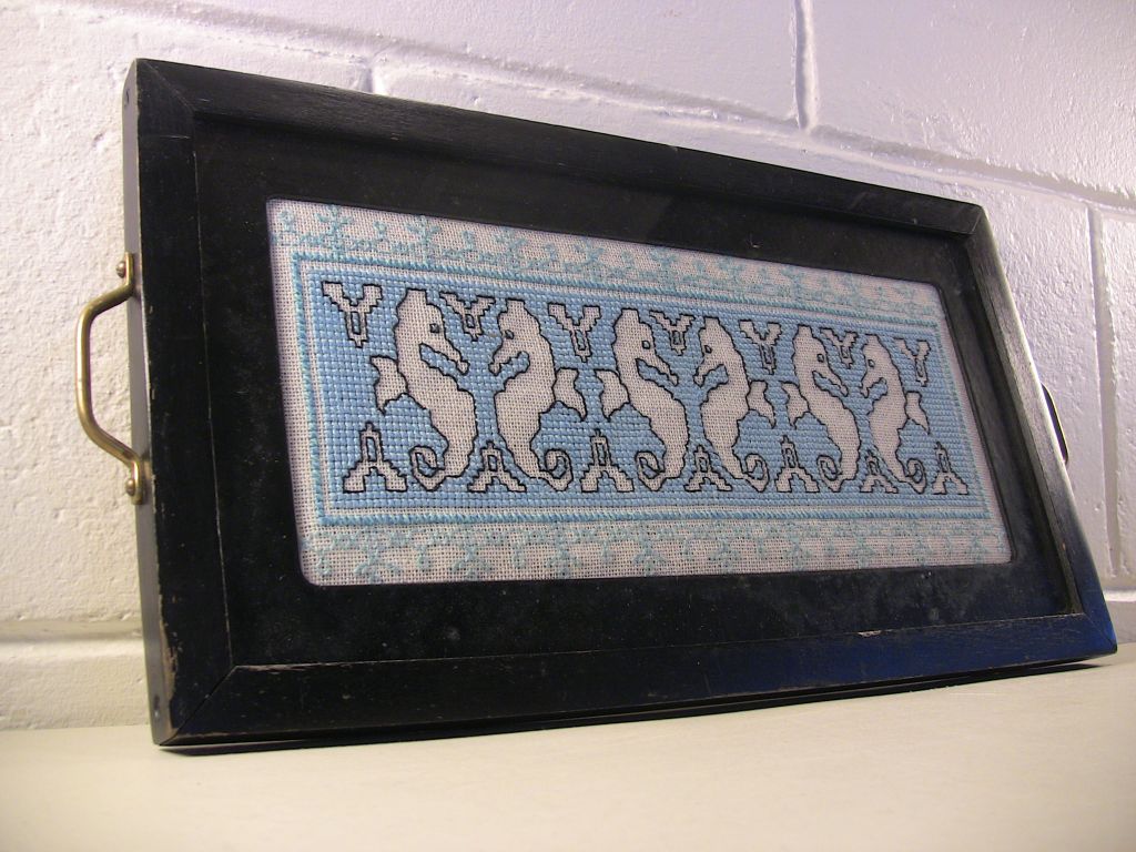 Vintage Serving Tray Drink Tray Framed Needlework Sea Horses Serving Tray Plaque Asian Flair
