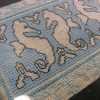Cross stitch seahorses with Asian motif decoration; black-outlined seahorses and pagodas with aqua blue stitched background on off-white canvas