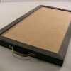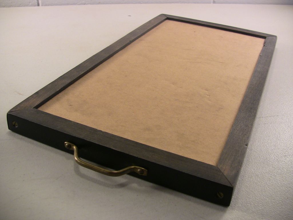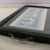 Charming Asian needlework showcased under glass in a black wood-framed serving or dresser tray with brass handles