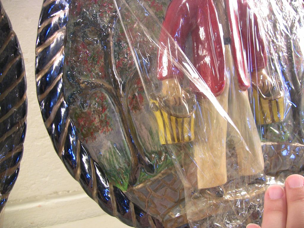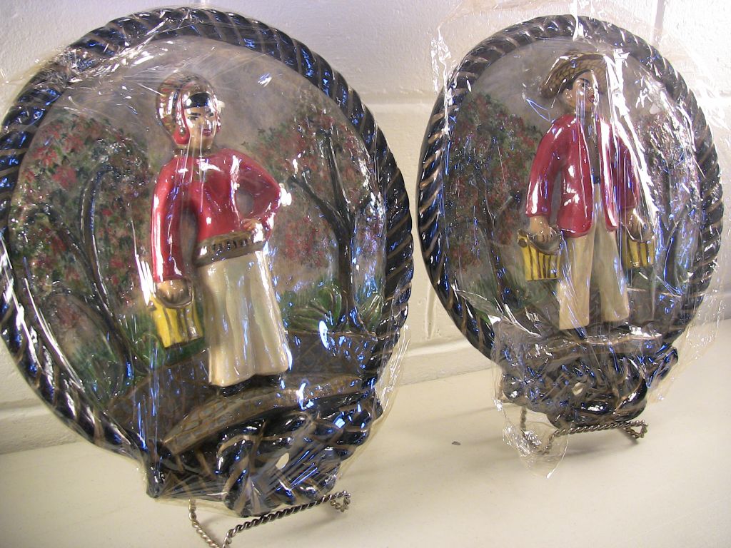 Excellent to mint unused vintage condition. Wall plaques are still in original cellophane wrap, which is yellowed and brittle with age.