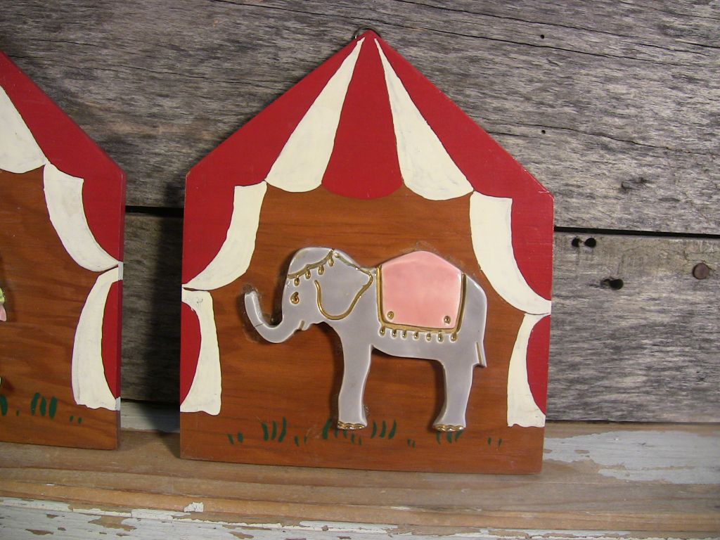 Vintage hand-crafted circus wall plaques with wear from age and use. Back of clown plaque has two horizontal splits across the back--appear to be original to the plywood. The ceramic elephant has a crack through the trunk, though still glued in place and secure. The glue job holding the ceramic figures was messy, some residue aside the figures. Painted surfaces most or all intact. Nice aged patina to plywood. Hanging eye hooks on back intact.