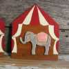 Charming vintage hand-crafted circus plaques featuring red and white big top tents with a clown on one and an elephant on the other; great for baby nursery or kids room decor, or a collectible for circus buffs.
