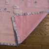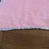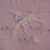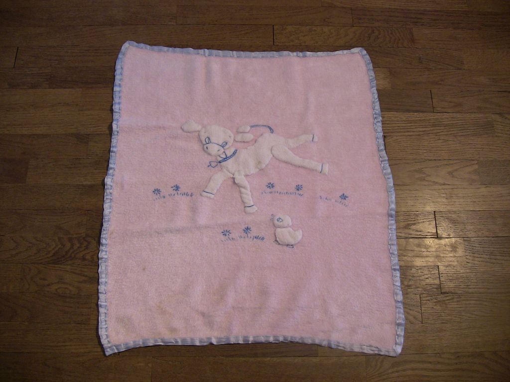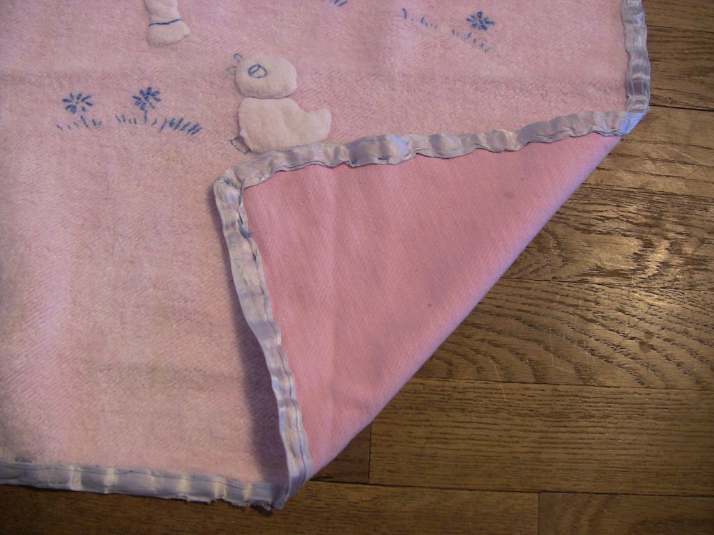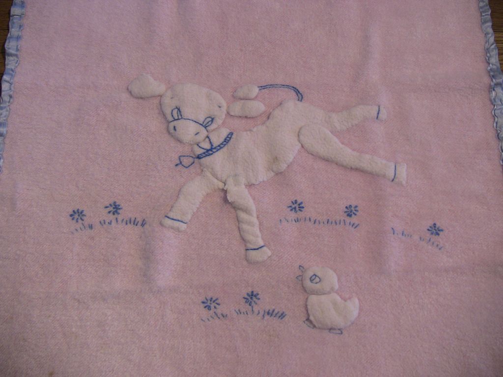 Charming vintage hand-sewn baby security blanket in pink fuzzy linen blend with blue satin edge shows a vignette of cuddly calf and chick in the meadow; frame it for an adorable nursery wall hanging.