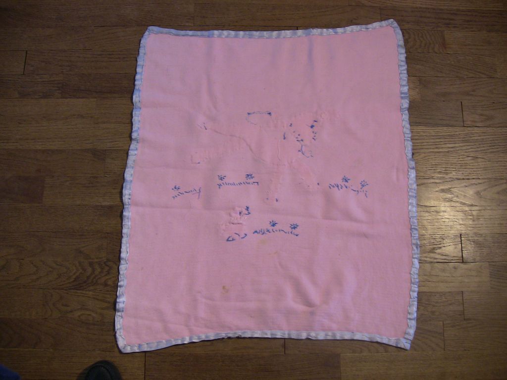 Charming vintage hand-sewn baby blanket with wear and soiling from age and use. Hand-sewn appliques' and embroidered stitching on central blanket; hand-sewn blue satin edge, large stitches. Some fade, stains and spots, age discoloration, and loose stitching throughout. On back of blanket, lower edge and left lower corner area, satin edge has approx 2 " of tear holes; see pics. Lovely hand-sewn baby blanket from the 1940s-1950s era. Frame-worthy. Has not been thoroughly cleaned--quick soaking only. May hold age and storage odors and soiling.
