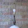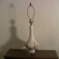 Vintage mid century frosted glass genie bottle lamp in very good condition with wear from age and use. Some medium finish wear throughout the pot metal base. Electrical cord is heavily soiled and yellowed, but good condition. No bottom felt or paper cover. Oxidation and wear throughout finish. No bulb or shade included. No chips, cracks, or breakage. Lamp is in good working condition, 3-way lighting functions properly: base, top, both base and top.