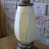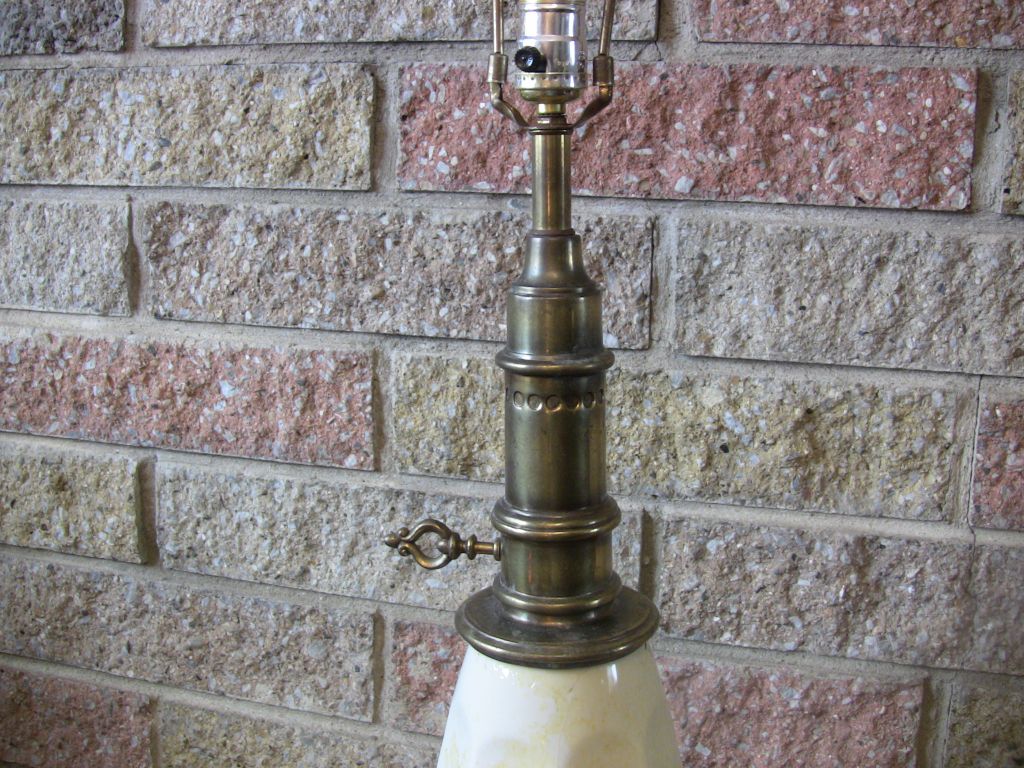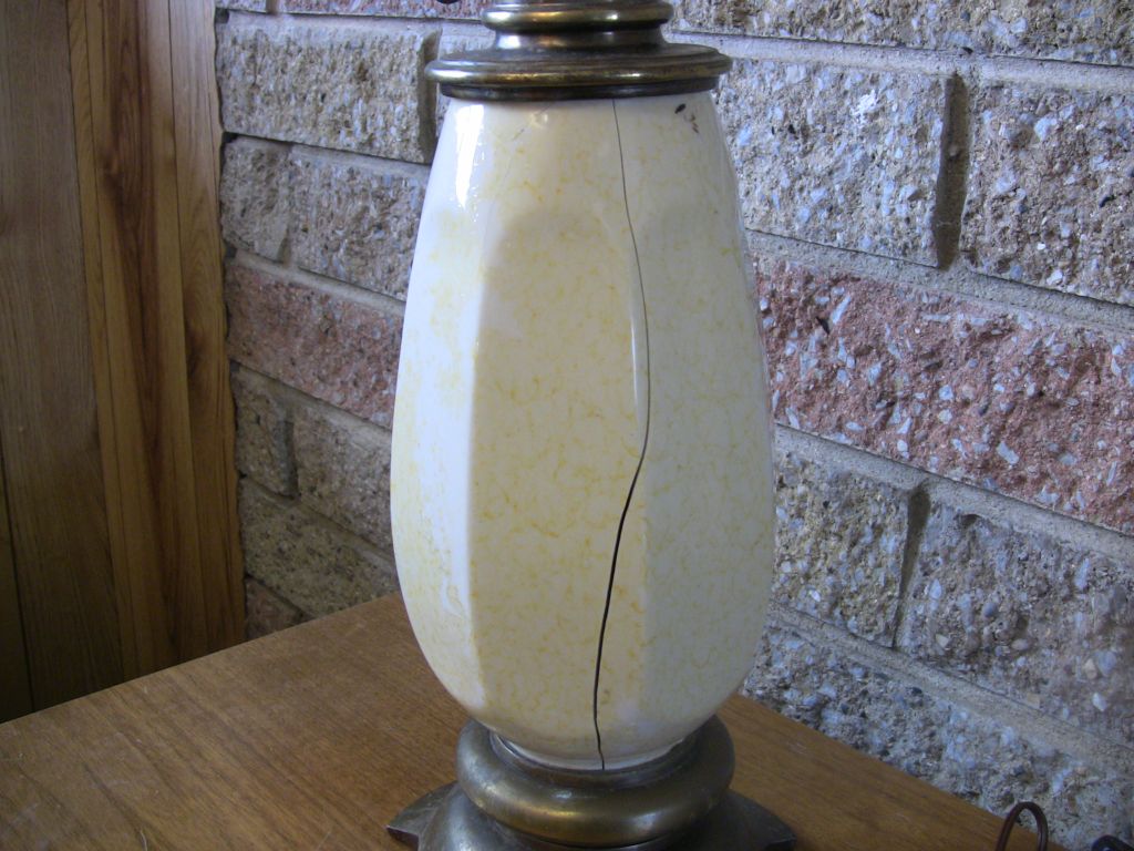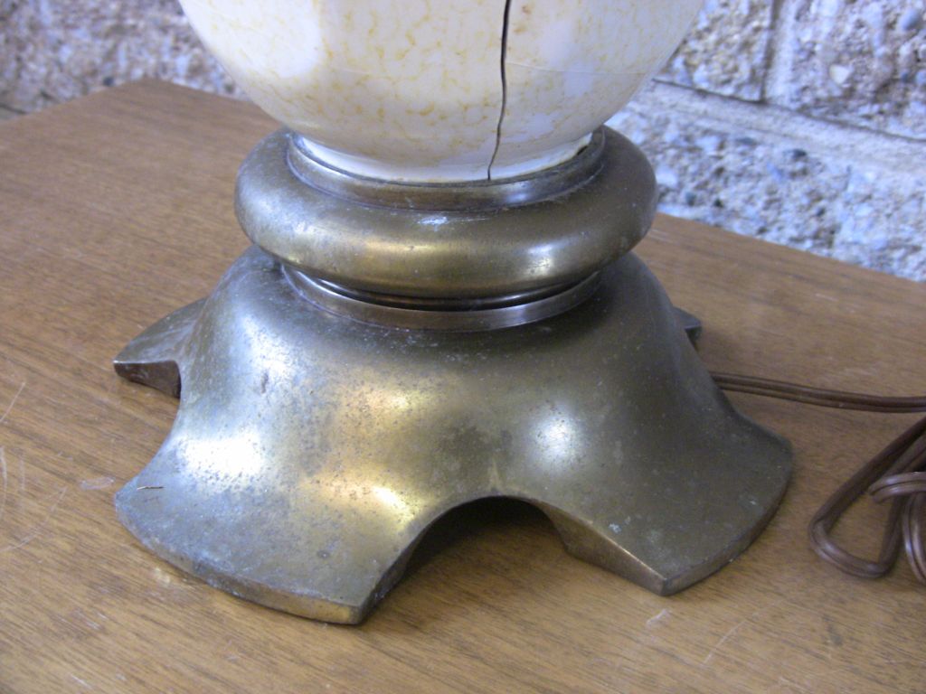 Brass Stiffel lamp with ceramic belly; belly has a full-length vertical crack separation; other cracks present (may be in two or more pieces after disassembling for shipment--selling AS IS, broken, with no guarantees in shipping)
