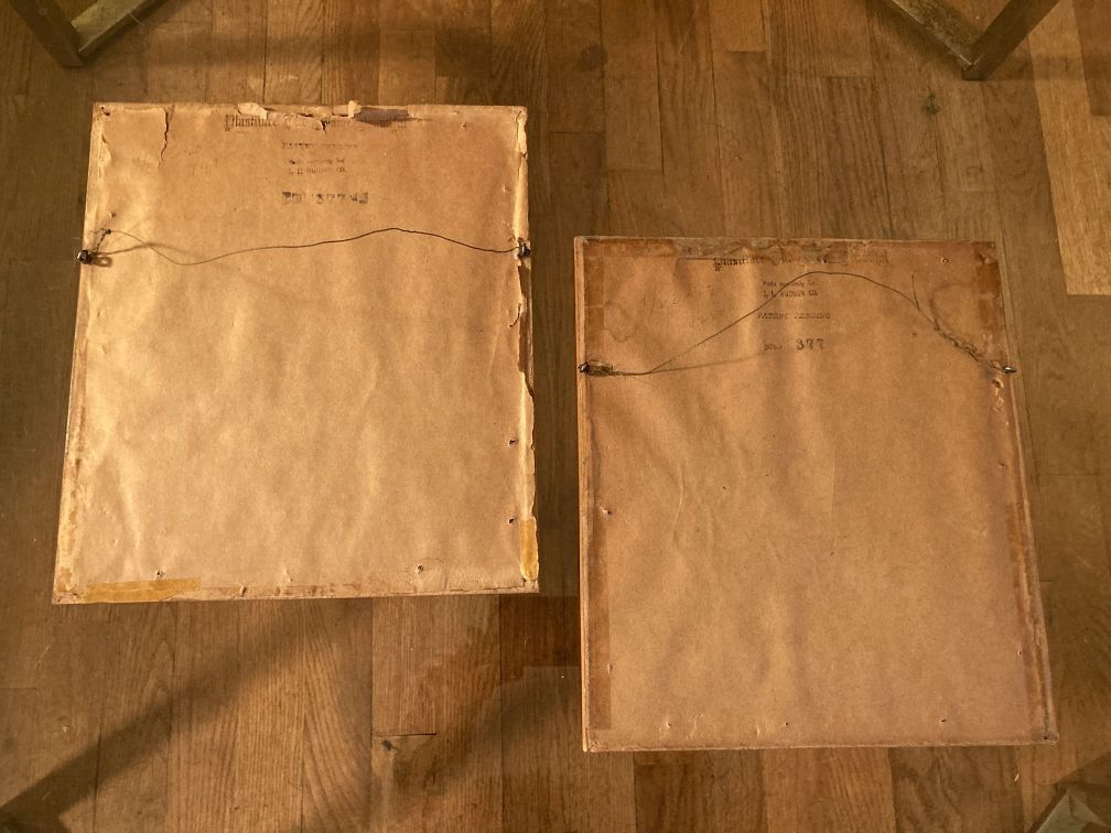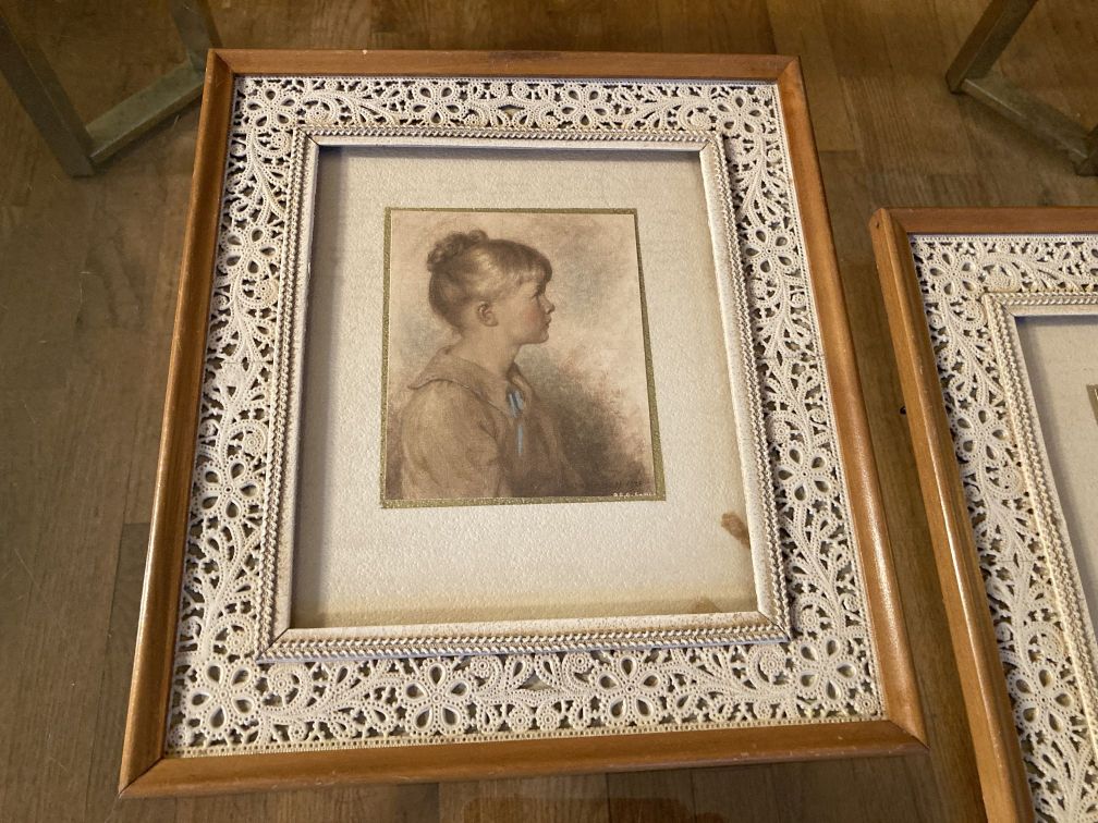 • Vintage pair of framed children's art prints in good condition with light wear and aged patina. Wood frames, glass, and matting in good condition with light wear and aged patina. Paper backing shows a bit more wear and tear. The Charlotte print shows slight slippage inside frame. Hanging wires on backs of both in good condition. Charming set of vintage children's commercial art prints date to the 1920s era and were made expressly for J. L. Hudson Co. by Plastilace.