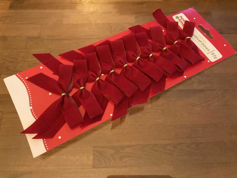 • Card includes 10 red velvet mini bows secured by gold foil corded wire; 4 cards of 10 bows available--this listing is for one card of 10 bows