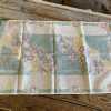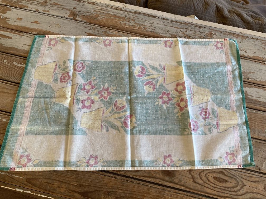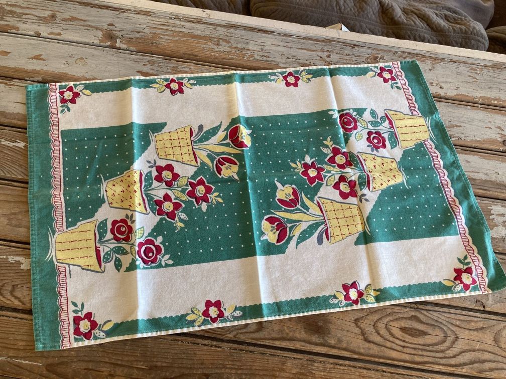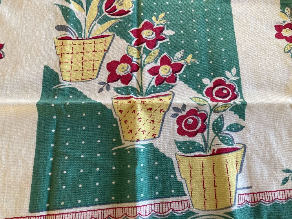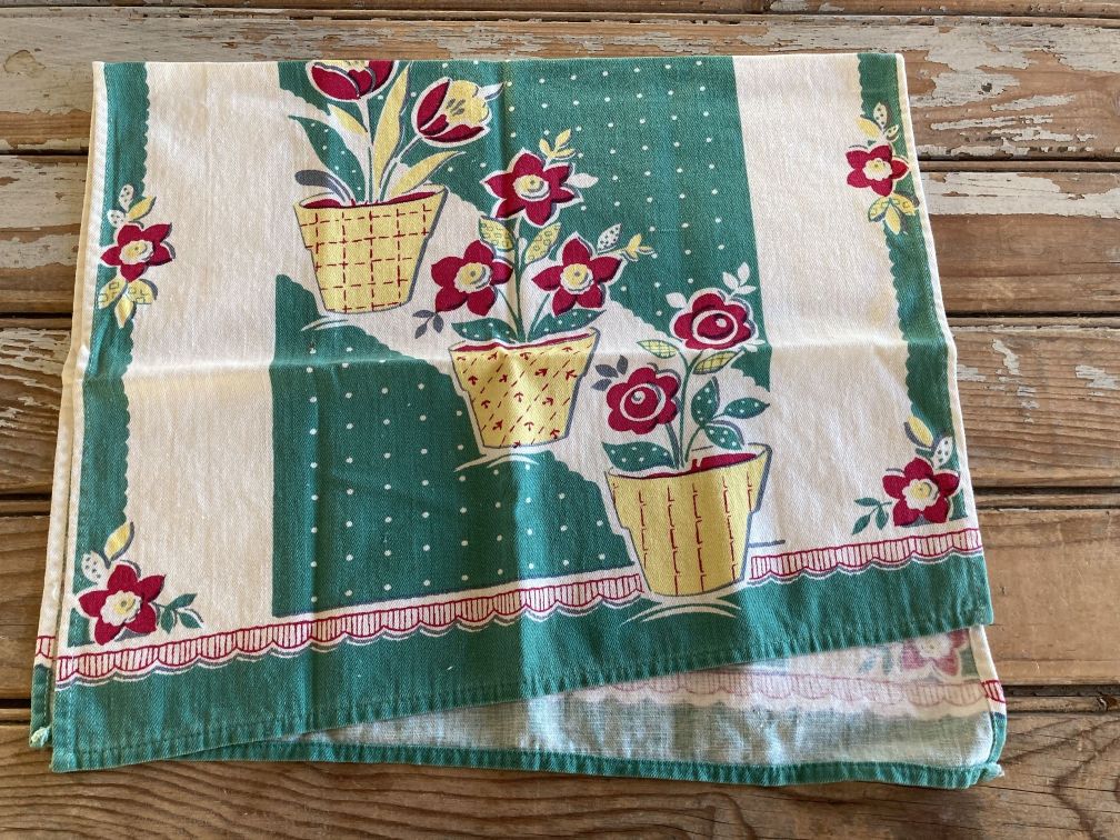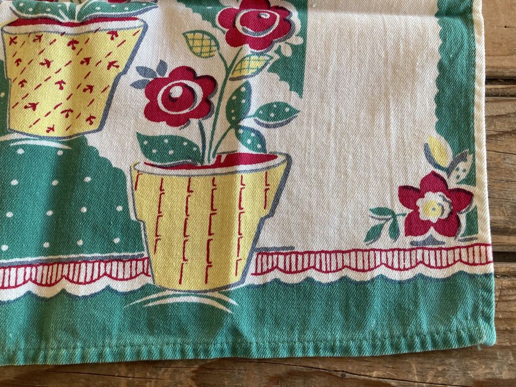 - Vintage kitchen towel in very good condition with light fade and signs of use. Light color fade and some very faint small stains here and there, not readily noticeable. Towel is cut off-square, as can be seen when folded in half--edges don't match up. No label or tag present. Charming vintage screenprint kitchen towel features potted flowers in yellow and red against a green and white background and dates to the 1950s.