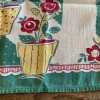 Charming vintage screenprint kitchen towel features potted flowers in yellow and red against a green and white background and dates to the 1950s.