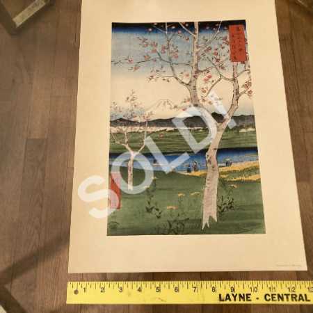 This marvelous Japanese ukiyo-e woodblock is one of a “prize collection of 8 beautiful and famous Japanese woodblocks, reproduced from the rare, old originals”; published by Penn Press, New York circa mid to late 1950s.  The Japanese term, ukiyo-e means “pictures of the floating world,” a euphemism for the entertainment or pleasure districts of urban centers.  Ukiyo-e were painted illustrations of Japanese daily life in urban centers, mercantile and trade, travel, landscapes, and seasons and weather, throughout the 1600s, 1700s, and 1800s.