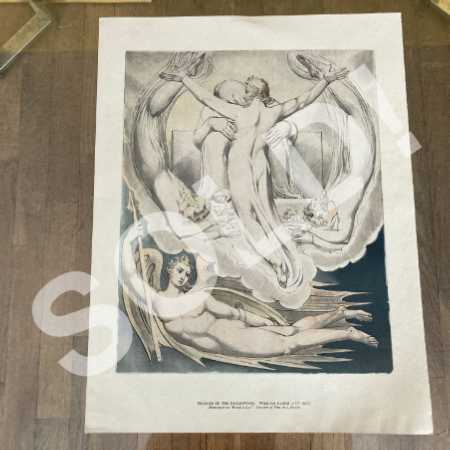 - Vintage William Blake “Paradise Lost” prints all in very good condition with light foxing along the bottom edge, from bottom center to bottom right corner, as shown in pics. Signs of light age discoloration, handling, and storage. These prints have never been framed. Beautiful vintage biblical art prints of William Blake’s 1808 water color illustrations to “Paradise Lost”, John Milton’s classic 1667 poem of the Fall of Man–the temptation of Adam and Eve, and their expulsion from the Garden of Eden.