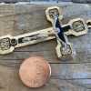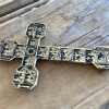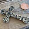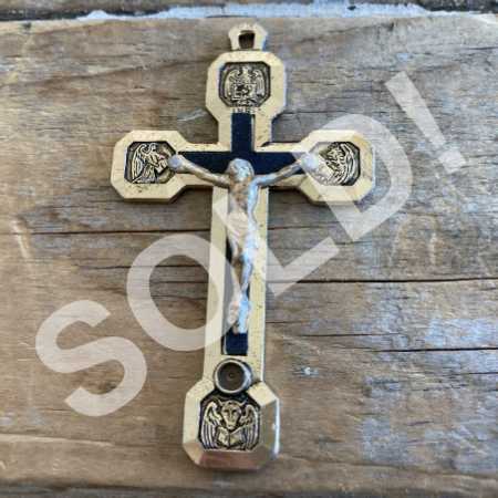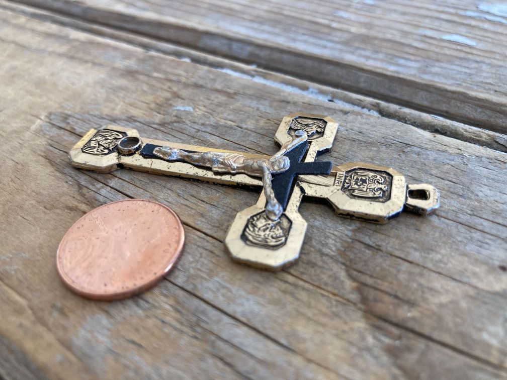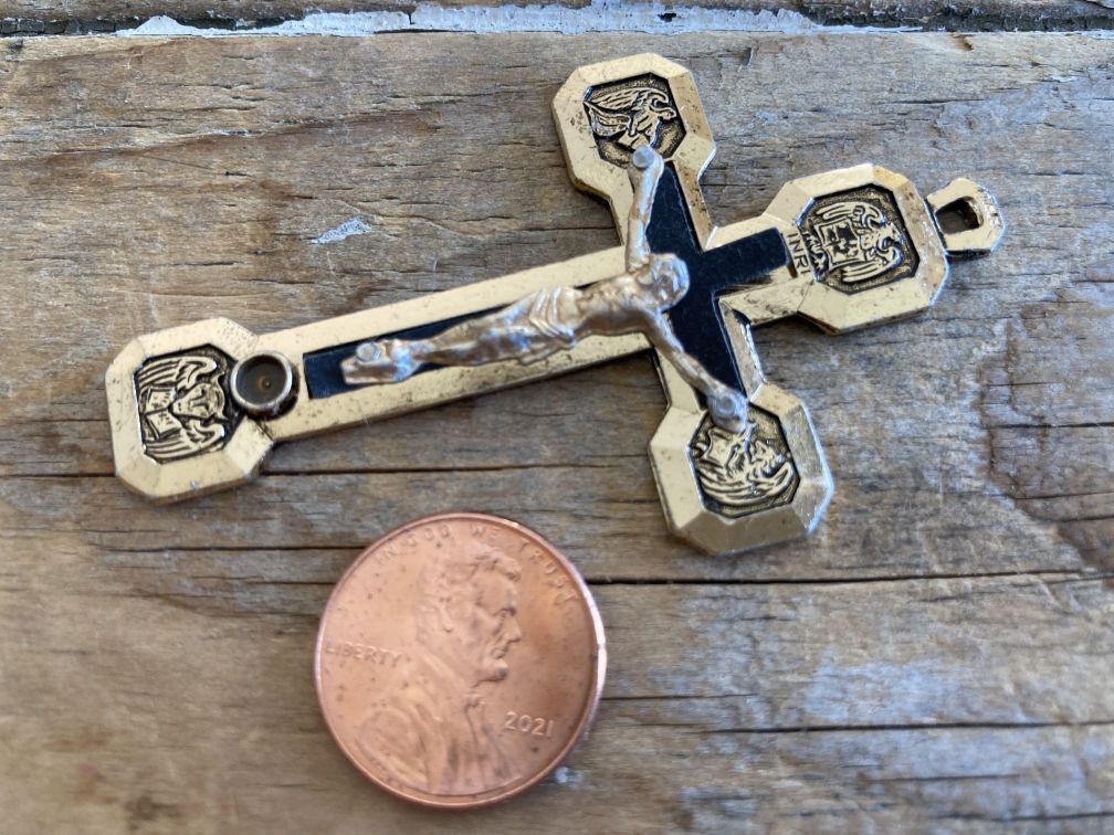 • Good vintage condition with wear, tear, and finish loss throughout.  Missing stone at feet of Jesus.  Black cardboard background behind Jesus’ body is lifting a bit at top.  Handsome religious pendant dates to the 1940s or 1950s and features pictorial creatures on all ends of the cross on the front, and the Stations of the Cross on the back.