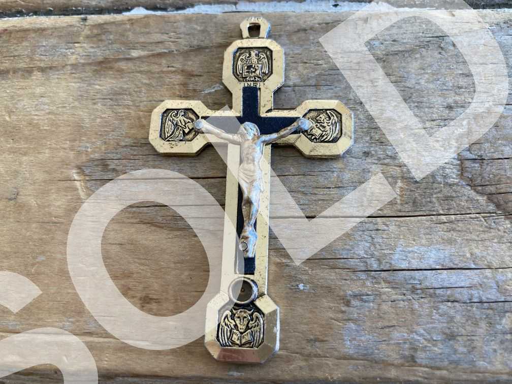 • Goldtone metal crucifix pendant charm with black paint accents; black cardboard background behind Jesus
