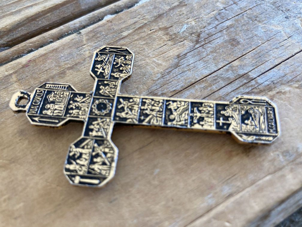 Handsome religious pendant dates to the 1940s or 1950s and features the crucified Jesus and pictorial creatures on all ends of the cross on the front, and the Stations of the Cross on the back.