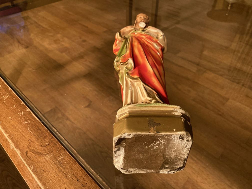 - Vintage chalkware Jesus statue, numerous chips, losses, and flaking paint throughout and glue repairs to head