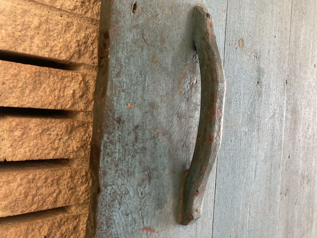 - Antique Wood Plank Cellar Door Blue Paint Carved Handle Rustic Farmhouse Vignette 27x57