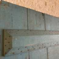 - Back is reinforced with upper and lower thick beveled cross planks heavily nailed in place