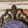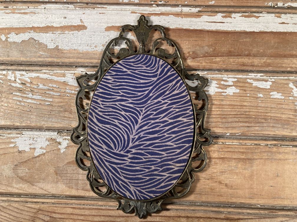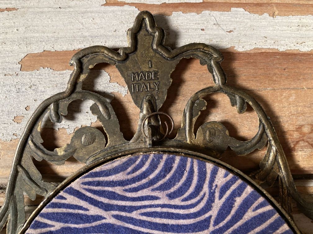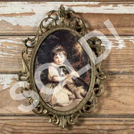 - Vintage decorative framed historical print in very good condition with light wear; no breaks or damage. Charming historical print of a girl and her dog is showcased in an oval brass decorative frame made in Italy.