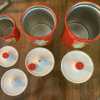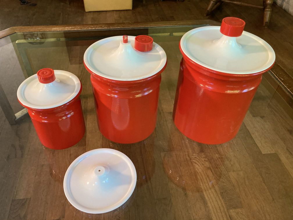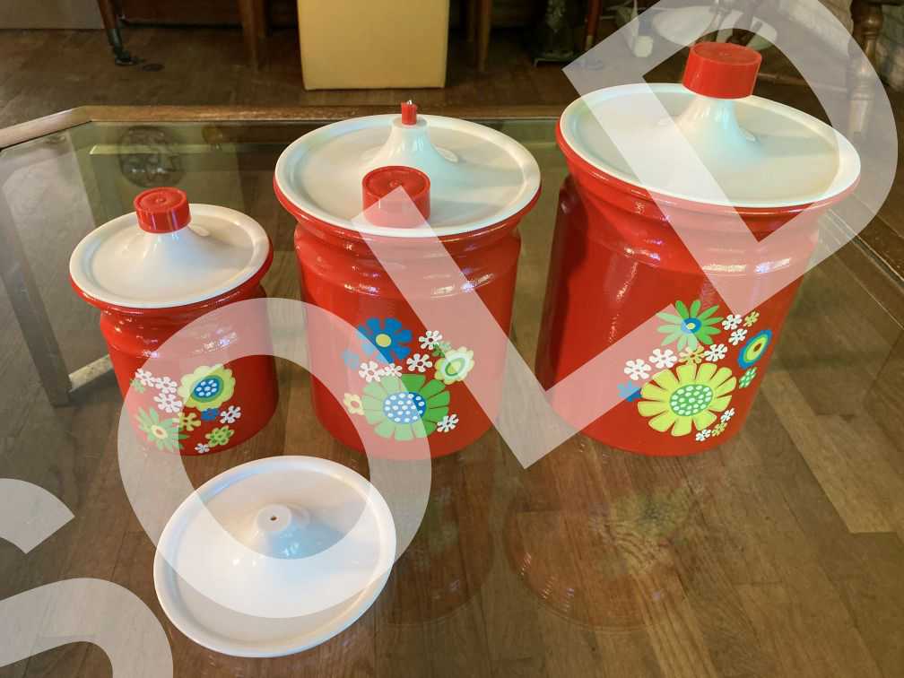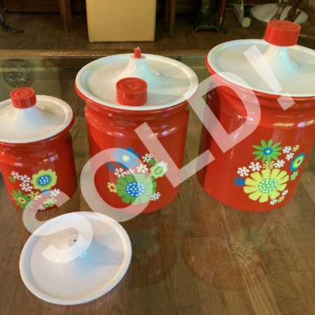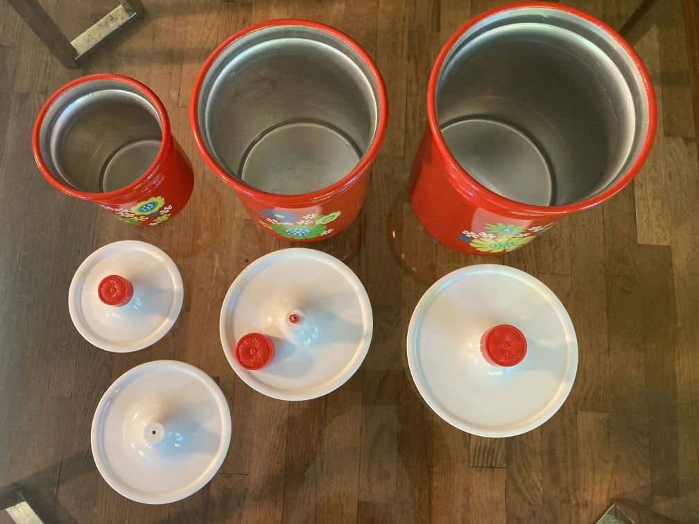 - Partial set of vintage metal canisters in very good condition with light wear. Only 3 of 4 original canisters are present; 4 lids present. One of the lids has a broken knob, one lid (extra) is missing a knob. Painted finish and design is in excellent condition with minimal wear. No other damage or losses. Vintage aluminum metal canister set features a bright red enamel finish, a colorful punch of flower-power daisies on the fronts, and white plastic lids with red knobs; they’ll brighten your kitchen as well as your day.