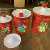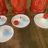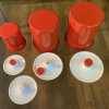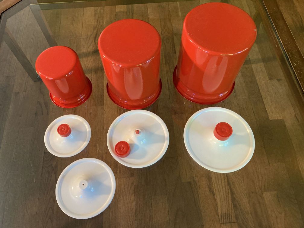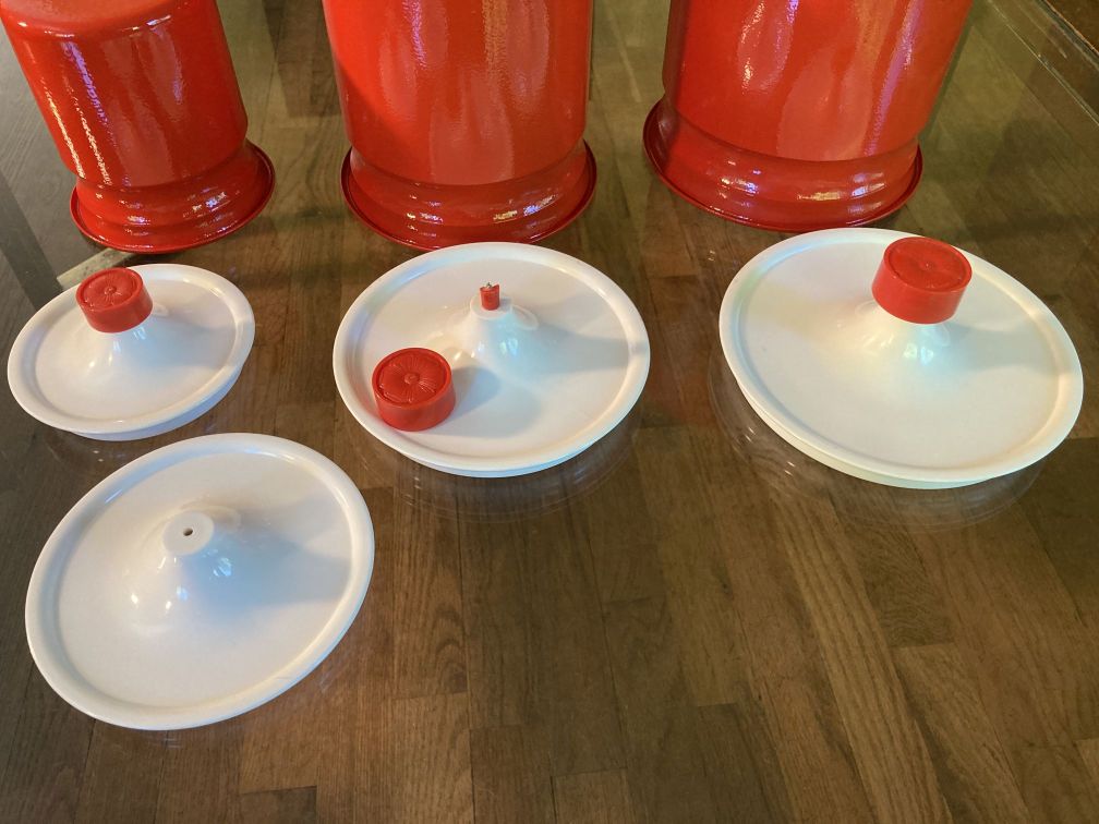 - White plastic lids with red plastic knobs; listing includes 4 plastic lids, one with a broken knob, and one missing a knob