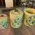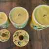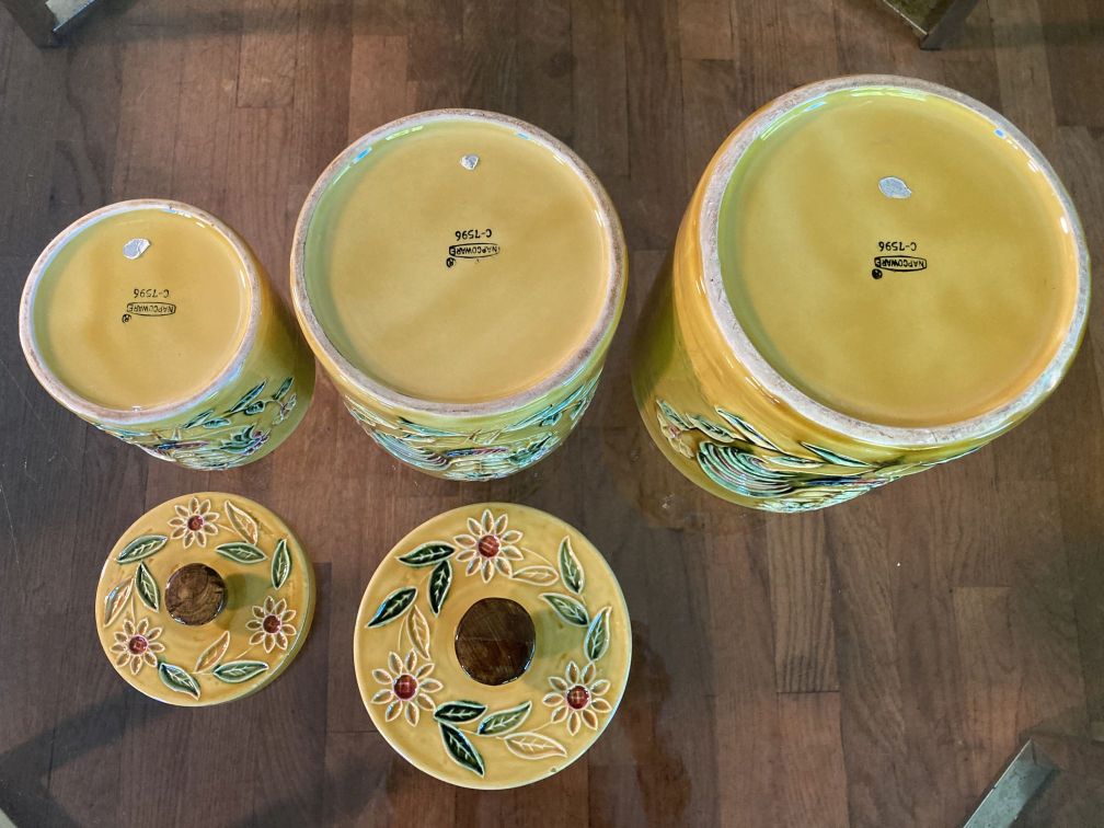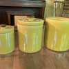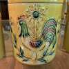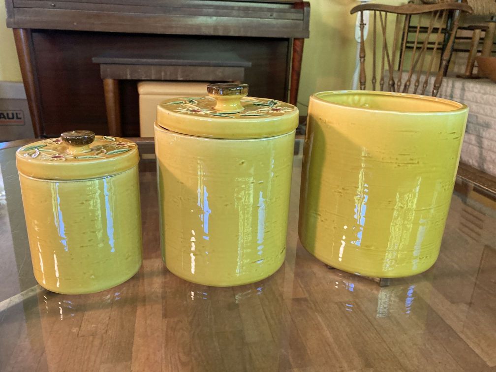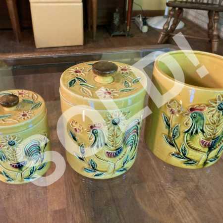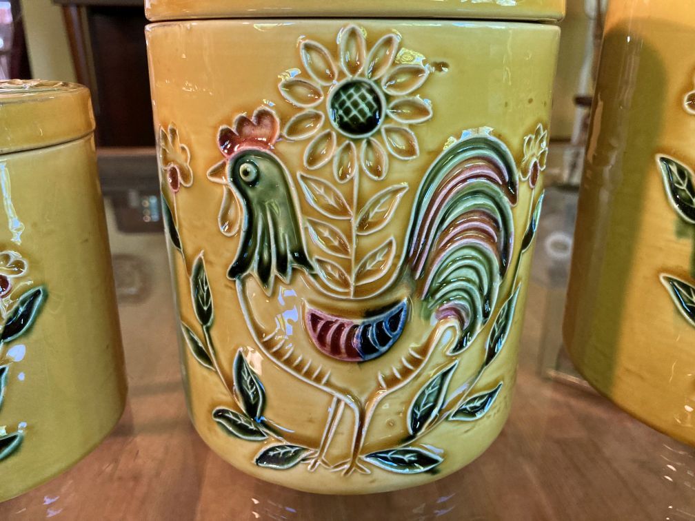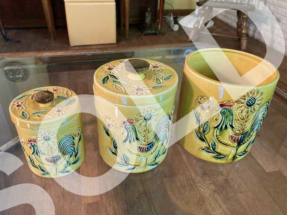 - Vintage partial ceramic canister set in very good condition with light wear. Set includes 3 canisters and 2 lids; the large canister lid is missing. No chips, cracks, or damage. This vintage golden yellow ceramic canister set with colorful raised rooster and flower motif was made by Napcoware and dates to the 1960s.
