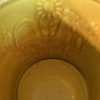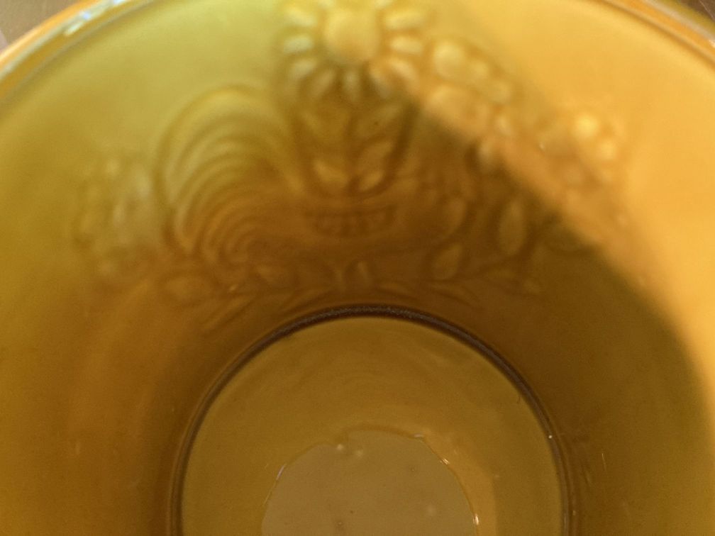 This vintage golden yellow ceramic canister set with colorful raised rooster and flower motif was made by Napcoware and dates to the 1960s.
