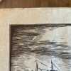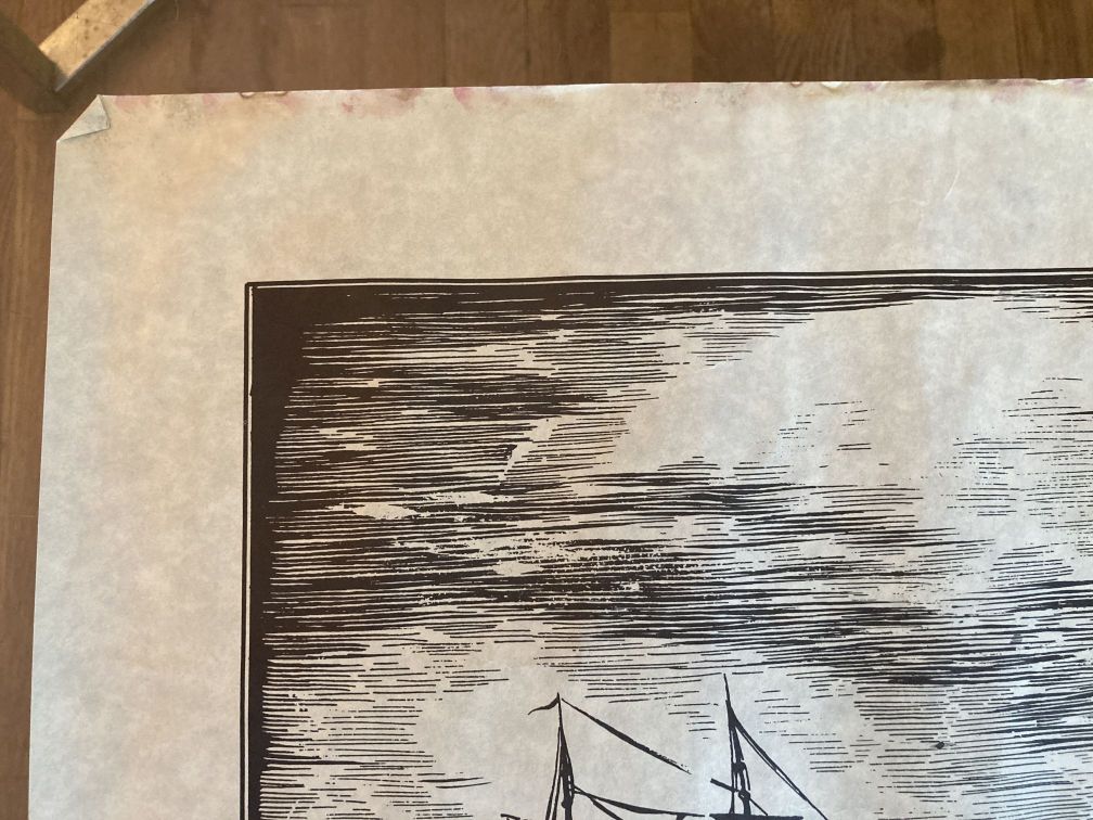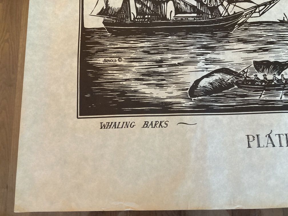 - Vintage woodcut print on parchment paper in good condition with light wear and tear from age, handling, and storage. All of the prints in this series have been stored rolled for decades. Light wear on edges, crumpling, corner folds, residue; top edge has a reddish or pinkish stain or residue as if the print had been torn off a pad or something (see pics). No rips or tears. Never framed. This print is one in a series of 4 delightful woodcut prints of 1800s whaling ships and vessels at sea and at port, signed Arnold, circa 1960s, in black graphics on parchment paper.