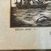 This print is one in a series of 4 delightful woodcut prints of 1800s whaling ships and vessels at sea and at port, signed Arnold, circa 1960s, in black graphics on parchment paper.