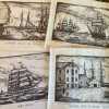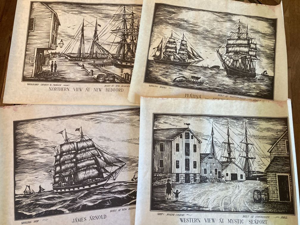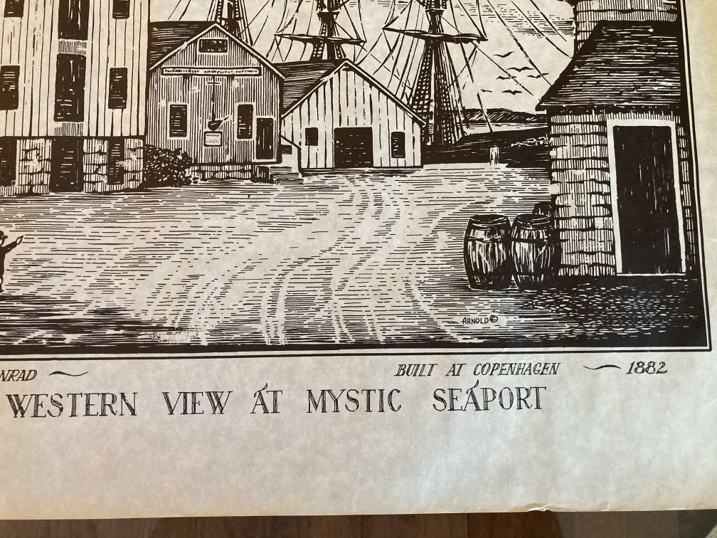 - Vintage woodcut print on parchment paper in good condition with light wear and tear from age, handling, and storage. All of the prints in this series have been stored rolled for decades. Light wear on edges, crumpling, corner folds, residue; top edge has a reddish or pinkish stain or residue as if the print had been torn off a pad or something (see pics). No rips or tears. Never framed. This print is one in a series of 4 delightful woodcut prints of 1800s whaling ships and vessels at sea and at port, signed Arnold, circa 1960s, in black graphics on parchment paper.