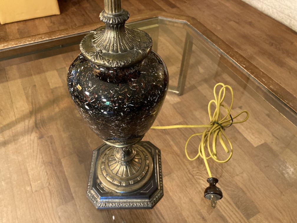 • Vintage Brass Bronze Trophy Urn Table Lamp Gold Fleck Black Glass Base 1970s Hollywood Regency
