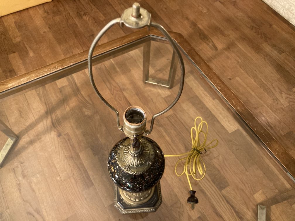 • Vintage mid century gold-flecked black glass table lamp in very good physical and working condition with light wear, no damage.  Missing finial.  No shade included.  Swanky and elegant Hollywood Regency table lamp features a gold-flecked black glass body, decorative metal base, and gold cloth cord.