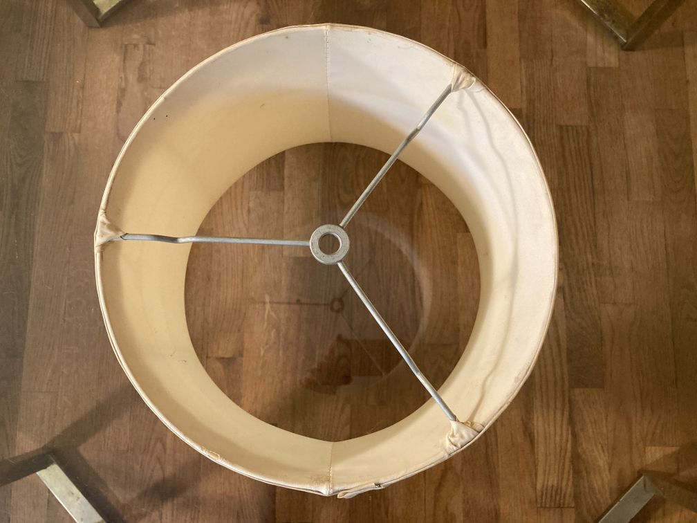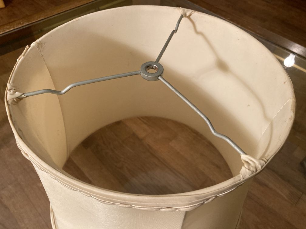 - Vintage silk lamp shade in good condition with wear. Light soiling, aged discoloration, a few small flecks and stains here and there, a few fabric rubs and a pinhole or two; priced accordingly. Lovely vintage silk lamp shade features a braided top trim and a spider fitter to nest on glass torchieres.