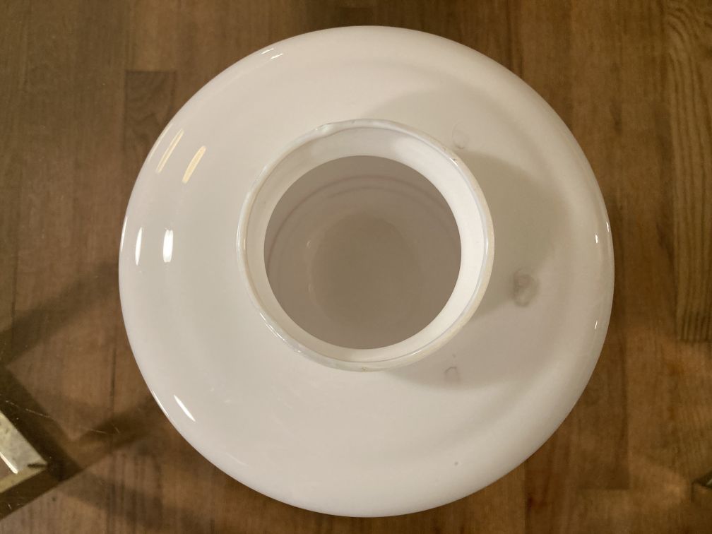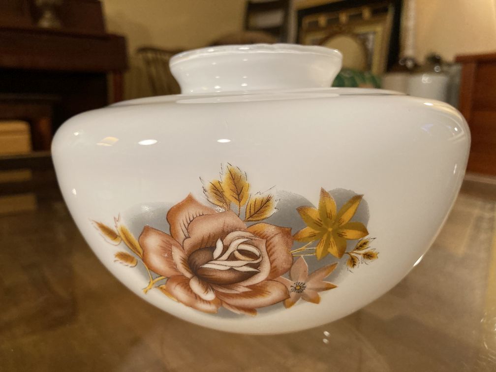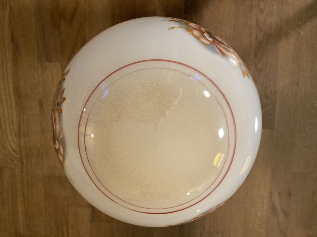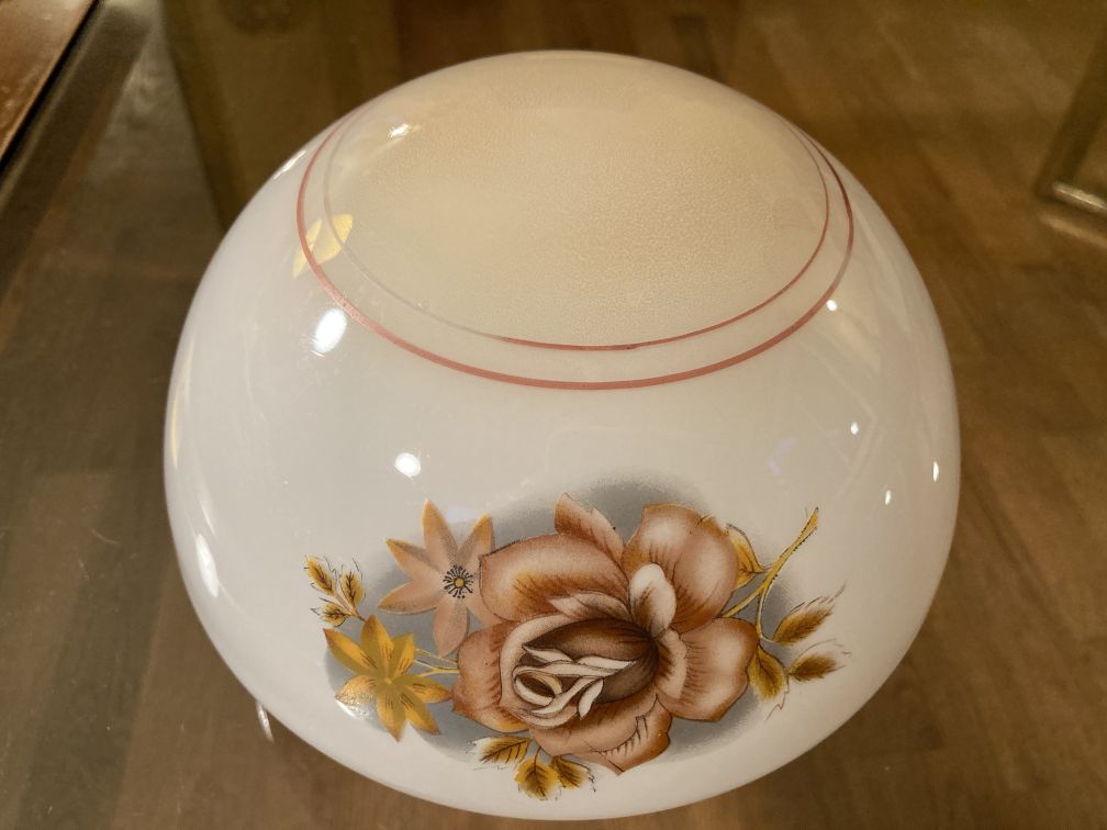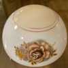 - Vintage dome-shaped ceiling light globe in very good condition with light wear. A few dark stains or flaws on top; no chips or cracks; very shiny and glossy. Charming little dome-shaped ceiling light globe is made of white milk glass with a tan bottom center, red pinstripes, and brown and gold flowers on gray decals.