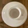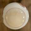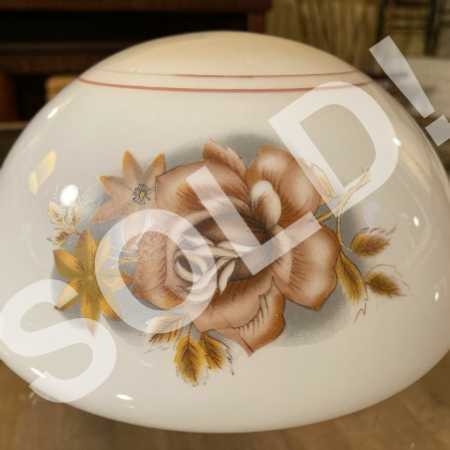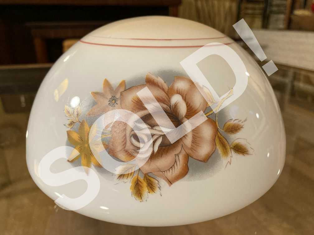 Charming little dome-shaped ceiling light globe is made of white milk glass with a tan bottom center, red pinstripes, and brown and gold flowers on gray decals.