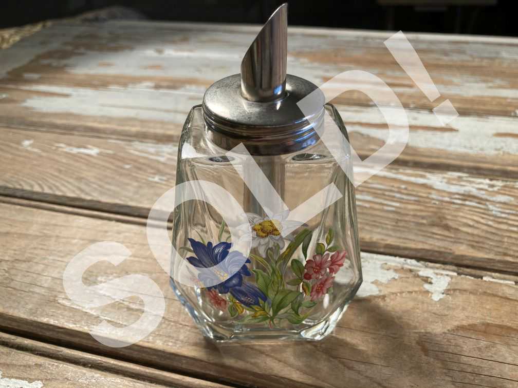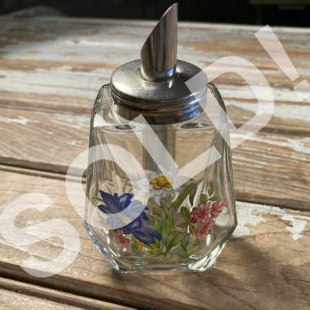 - Vintage Glass Sugar Shaker Pourer Flower Decal Stainless Steel Spout Vaduz