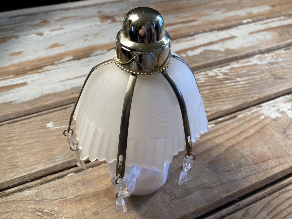 - Vintage opalescent glass decorative perfume bottle diffuser in very good condition with light wear. Some finish wear and oxidation on the metal umbrella ribs and plastic cap. One of the umbrella ribs is slightly bent. Opalescent glass finish is glossy and intact. No chips, cracks, or damage.