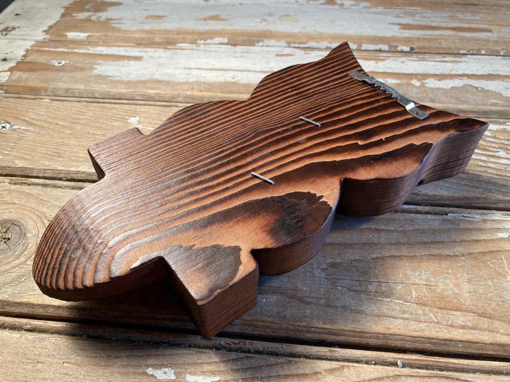 - Dark brown wood stain; golden yellow and orange felt eye color, and black plastic pupils