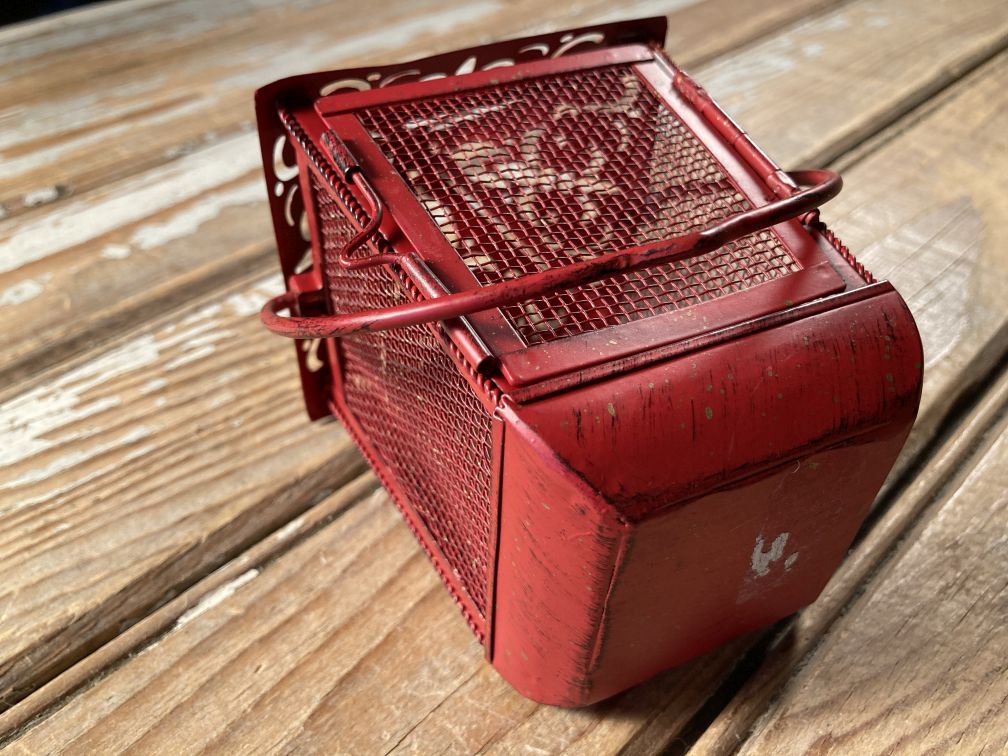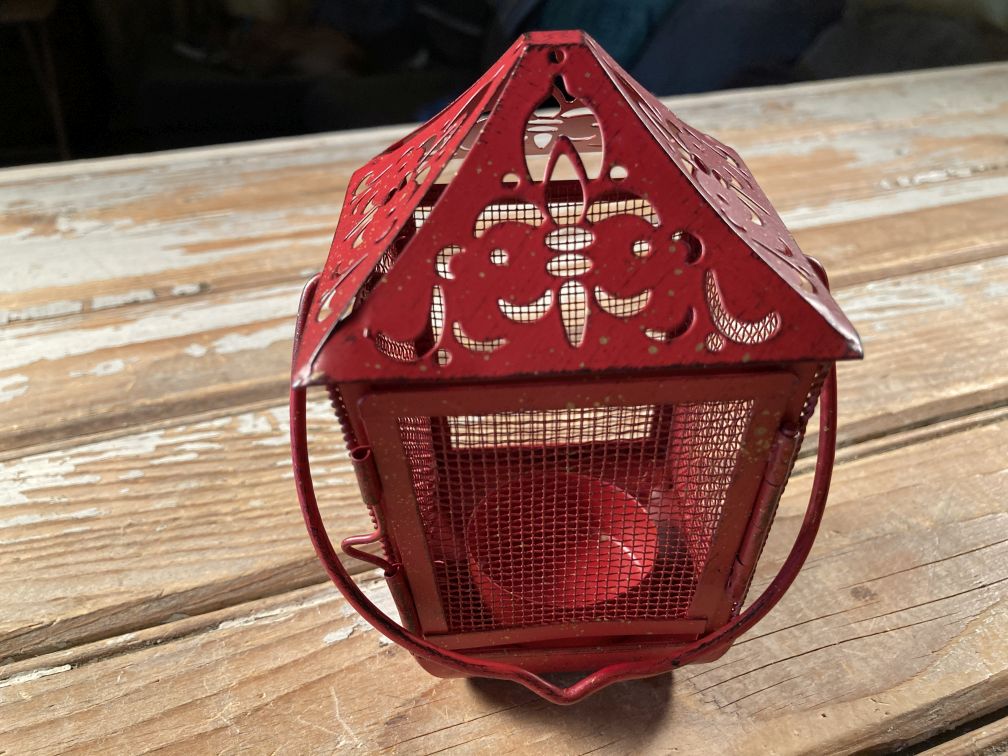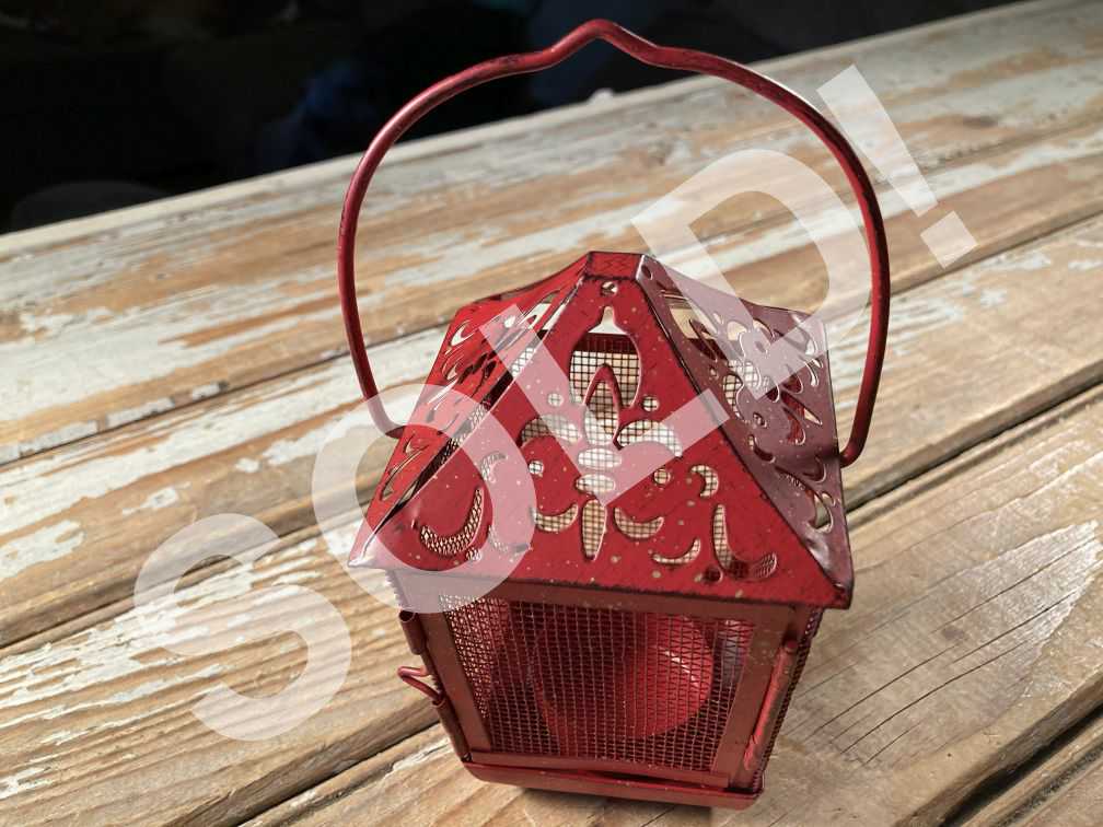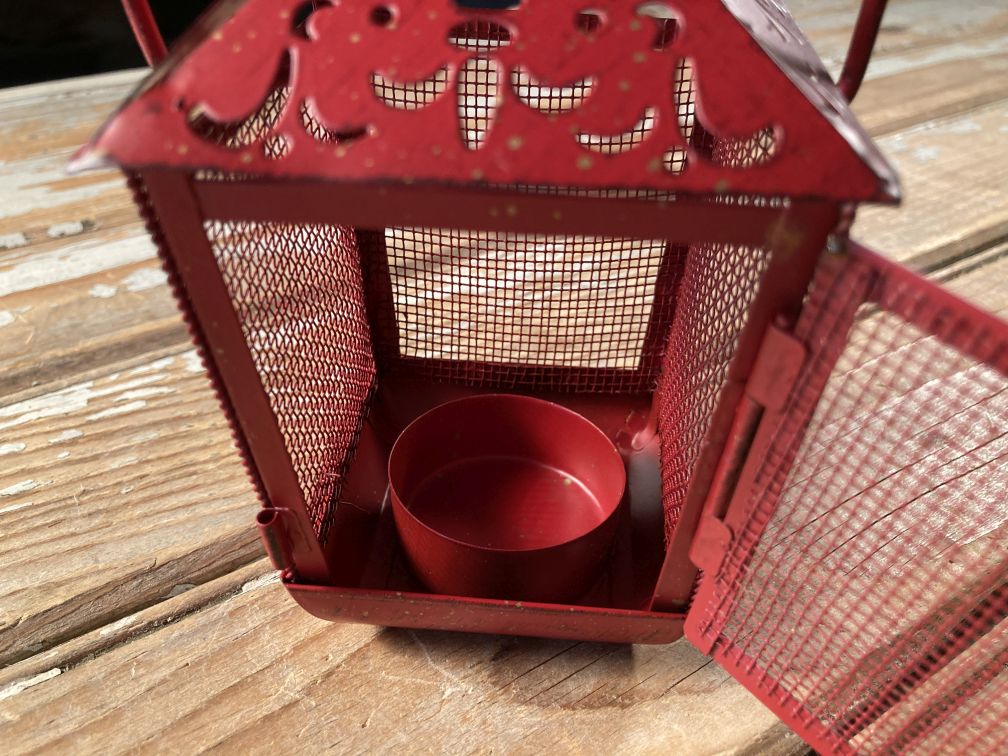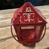 - Vintage Pierced Tin Lantern Hanging Tea Light Candle Holder Red Metal Screen 60s
