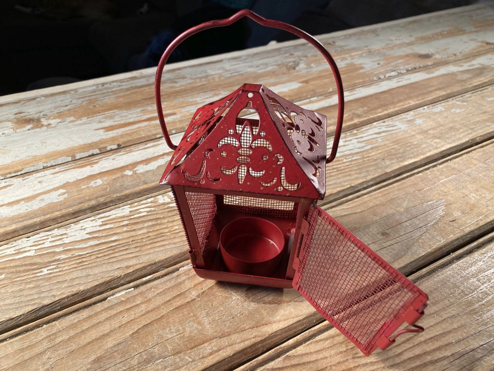 - Small pierced tin and screen hanging tea light candle holder