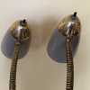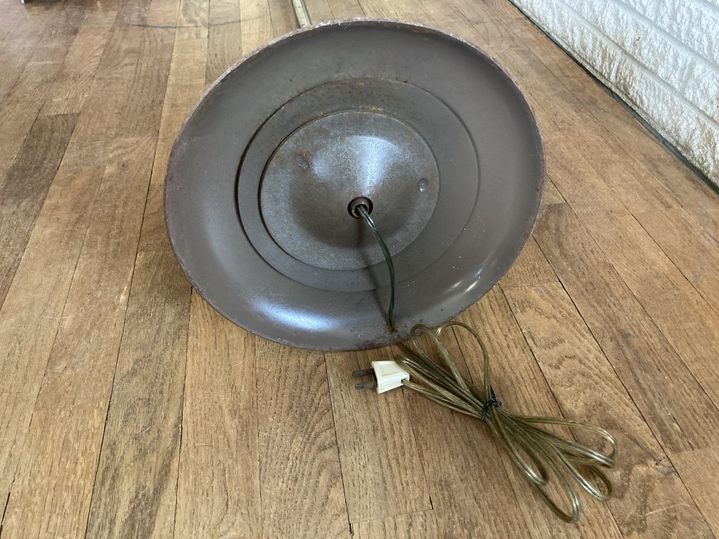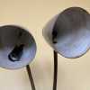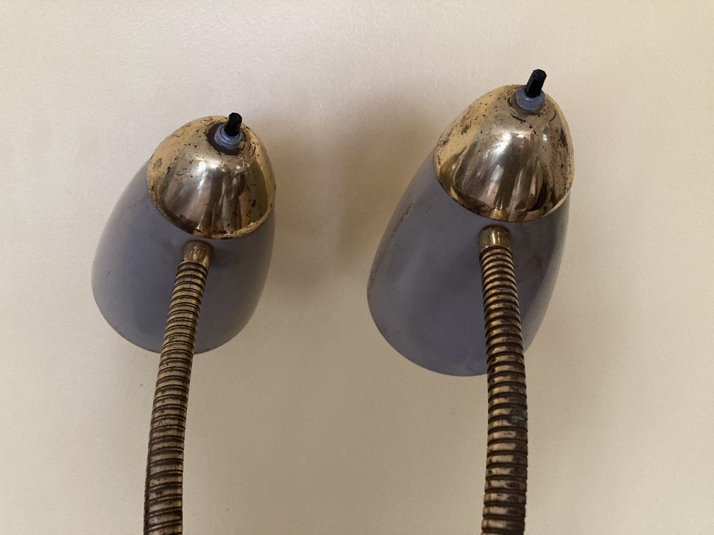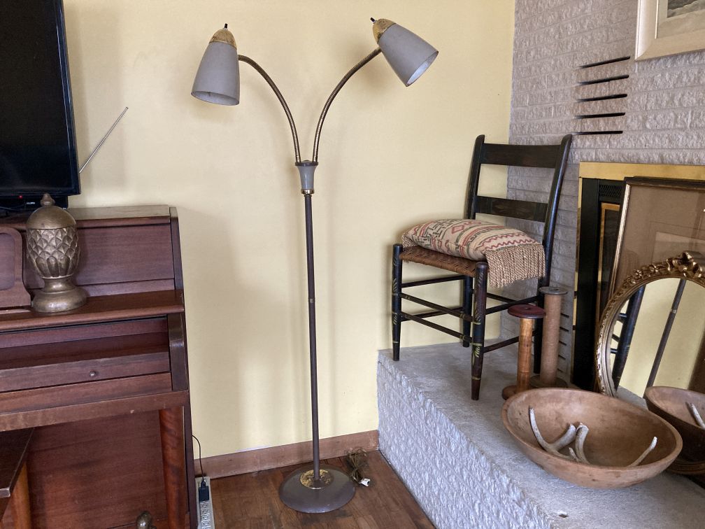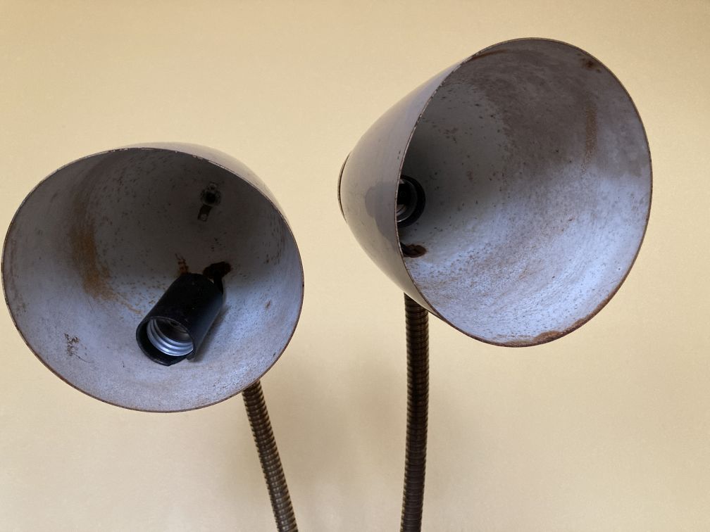 - Vintage mid century metal floor lamp in good physical condition with significant finish wear, tear, and surface rust, especially on the inside of shades and all of the brass parts. Cord is gold--may not be original. Both original switches and sockets need replacement. Untested–did not test with bulbs. The lamp should be thoroughly tested and repaired by a qualified professional prior to use. This fabulous mid century atomic space age adjustable gooseneck lamp has a companion floor lamp being sold concurrently and shown in last picture–inquire within.