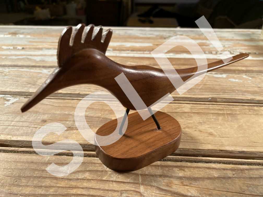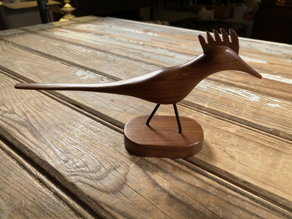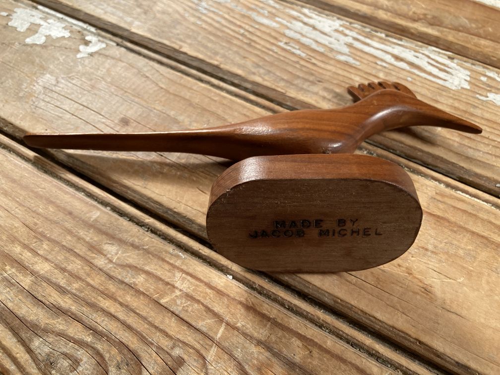 - Vintage carved bird figurine in very good condition with minimal wear; no damage. This charming carved bird figurine, by artist Jacob Michel, dates to the 1960s or 1970s, and features long tail, pointed beak, plumed head, and black wire legs, all in mid century modern style.