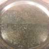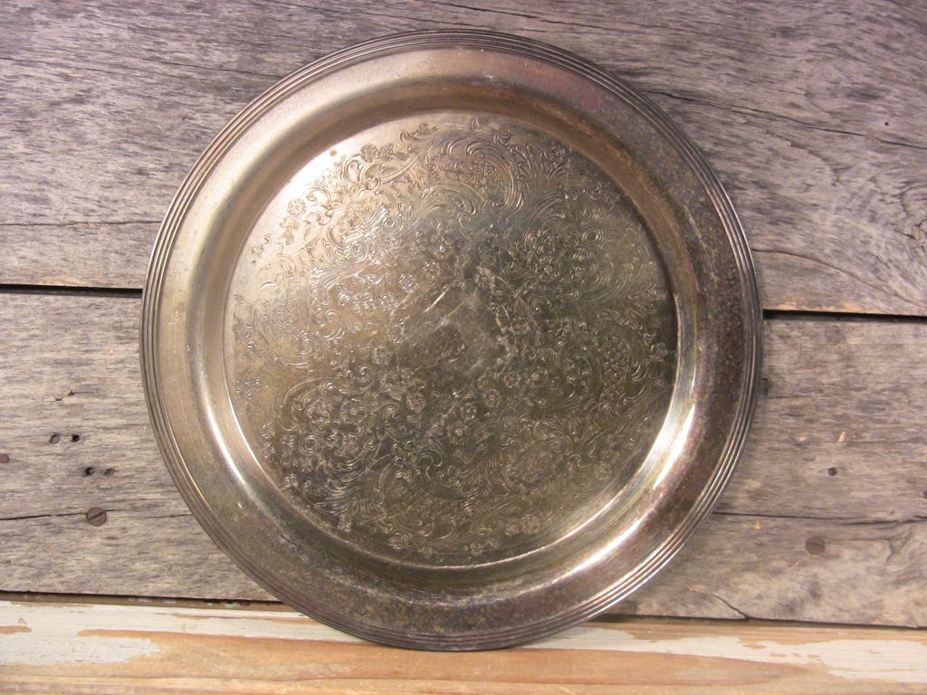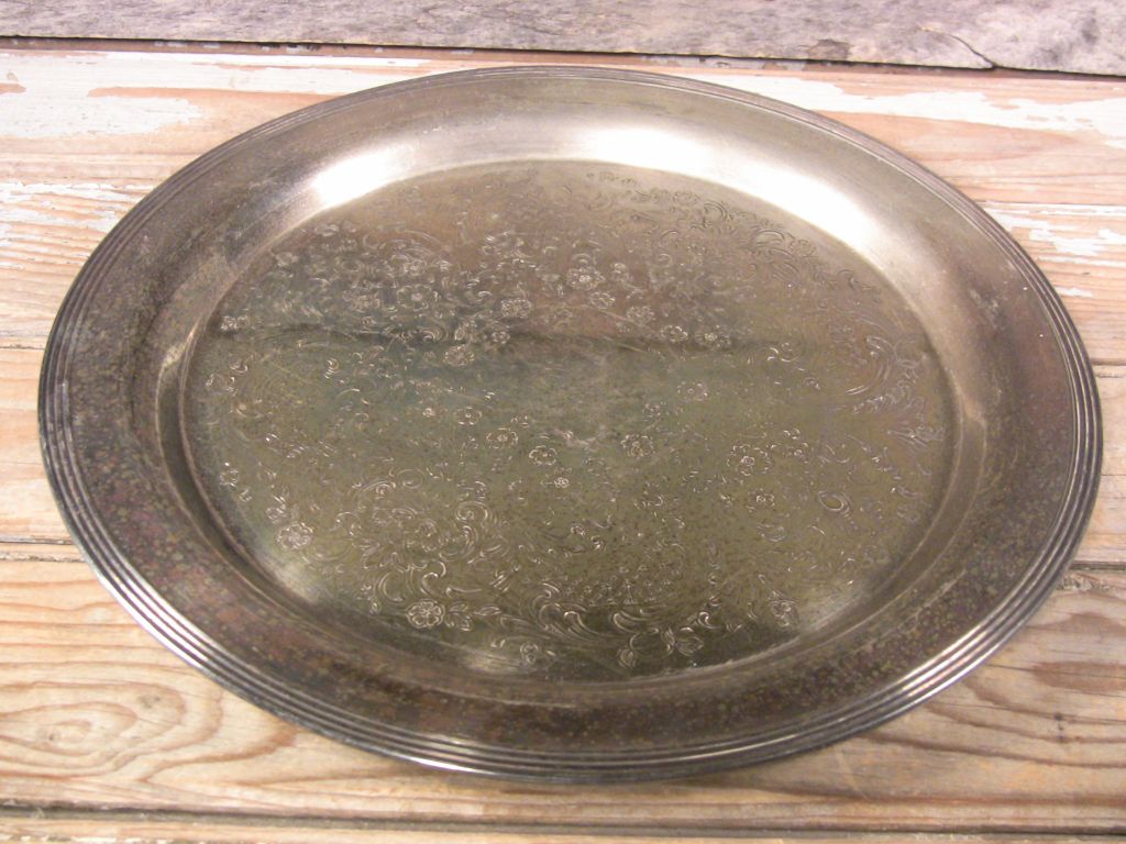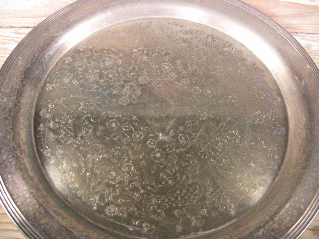 - Round vintage silverplated serving tray in good condition with wear, tear, and patina from age and use; fine scratches throughout; no damage. Beautiful round vintage silverplate serving tray features intricate floral pattern on base, sloped border, and a triple-banded rim; makes an elegant display when not in use.