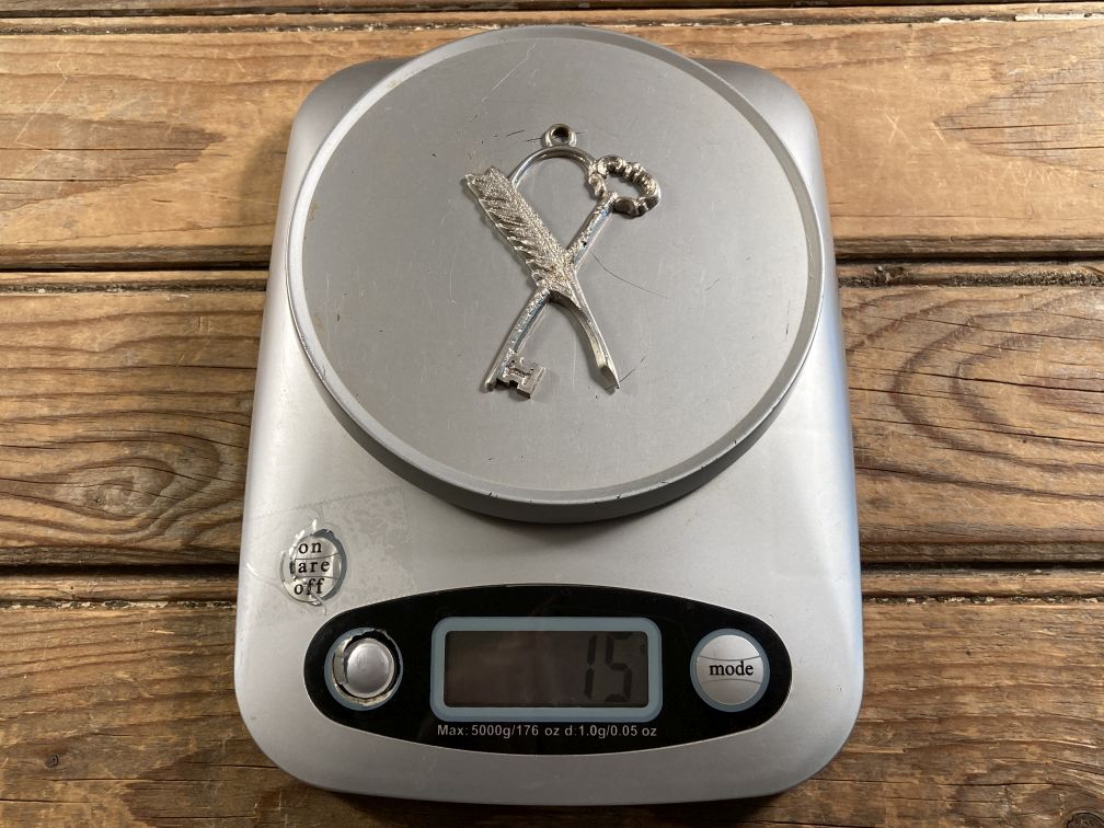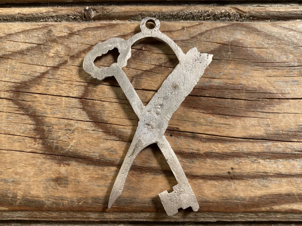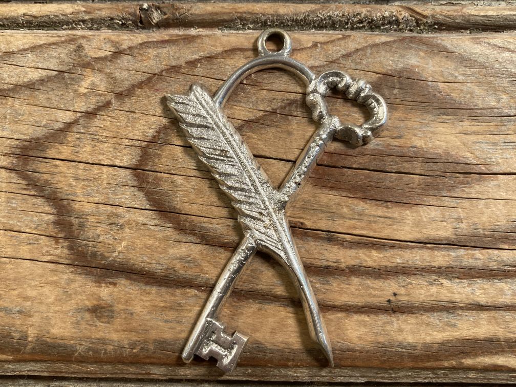 - Silver pendant of crossed key and quill, which may symbolize the secretary treasurer (aka the financial secretary) of a fraternal organization such as the Freemasons or the Knights of Columbus