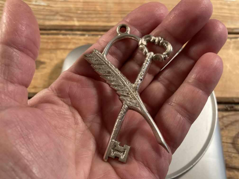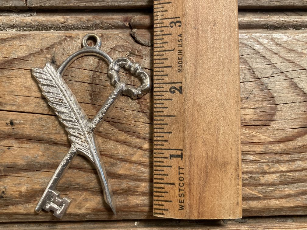 This large vintage necklace pendant is either sterling or silver-plated non-magnetic metal, and features a crossed key and quill, which may represent the Office of the Secretary Treasurer, also known as the Finance Secretary, in some fraternal organizations such as the Knights of Columbus and the Freemasons.