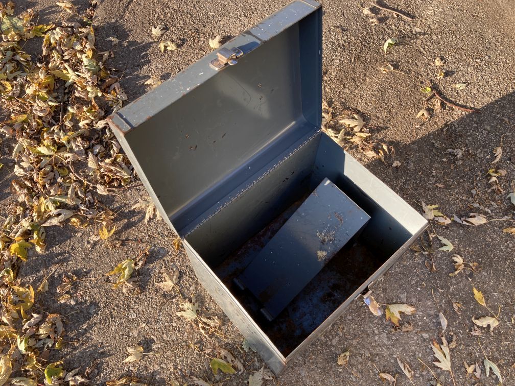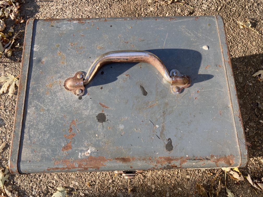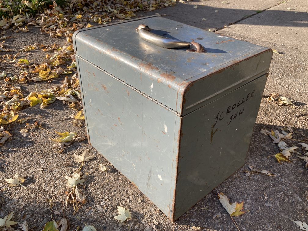 - Vintage Metal Tool Box Gray Steel Cubic Skilsaw Circular Saw Storage Chest Industrial Décor 13-in