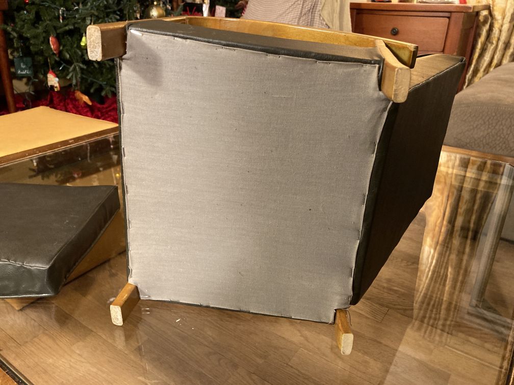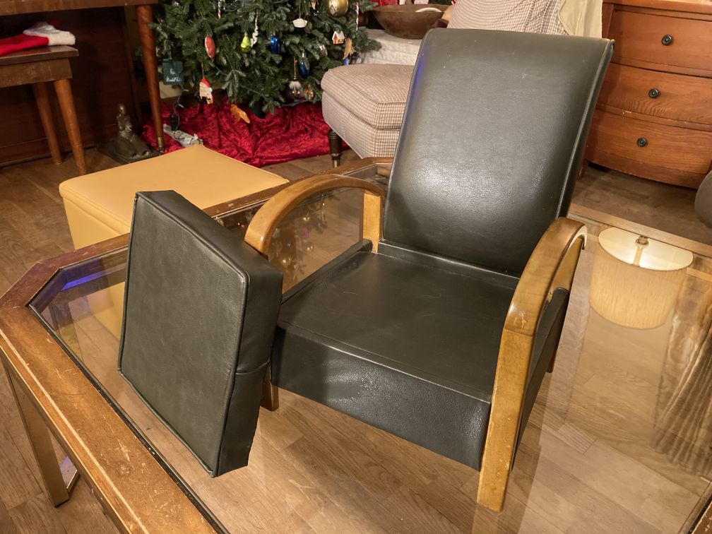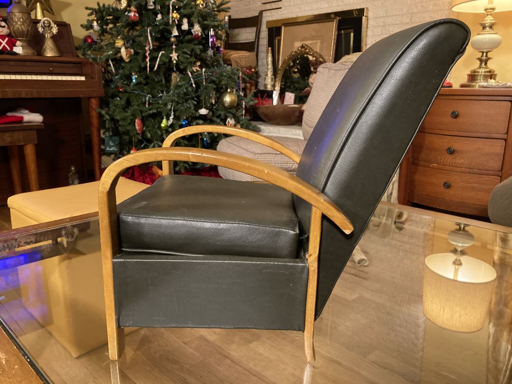 Vintage doll chair in excellent condition with light wear, tear, and patina. Faint white shadow fingerprint marks on one side of the seat cushion; gouged scratch on the back end of one arm rest. No tears, rips, or other damage. This darling mid century modern bentwood lounge doll chair or salesman’s sample exhibits fine quality craftsmanship and is an exact miniature replica of its high-end, full-size counterpart; dates to the 1960s or 1970s.