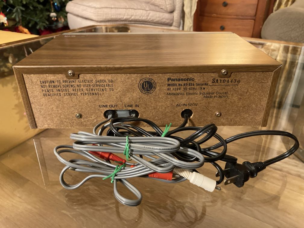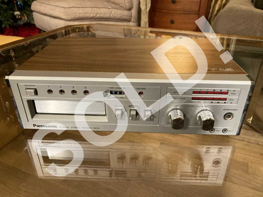 - Vintage Panasonic 8 track player in excellent physical condition with only the lightest wear; one scratched area to the left of tape insert. UNKNOWN, UNTESTED WORKING CONDITION (no 8 track tape to test), but no lights turn on when plugged in; selling AS IS, UNKNOWN WORKING CONDITION, and may need repair. Cords are in excellent condition with no issues. No owner’s manual included, but may be available for sale online; service manual available for free online, and will be printed and included with player. Original box in very good condition with light soiling, and one water stain on face. This vintage Panasonic 8 track tape deck features pause, fast forward, counter with reset, both right/left record level controls and both right/left VU LED meters, and dates to the later 1970s; it has not been tested by me, and may or may not need repair; it is being sold AS IS, UNKNOWN WORKING CONDITION.
