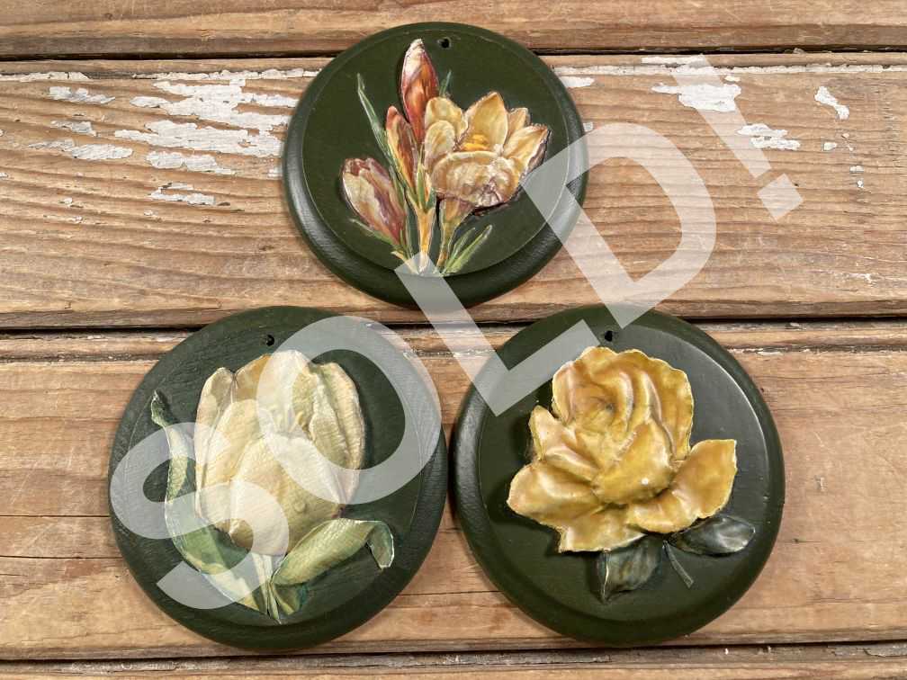 - Vintage Miniature Floral Wall Plaques Set of 3 Wood w- Applied 3D Flowers Roses