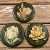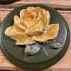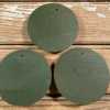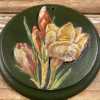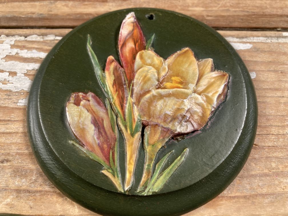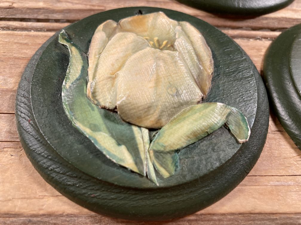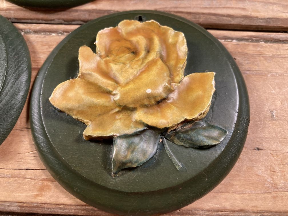 - Green painted round wood plaques with applied composite flowers